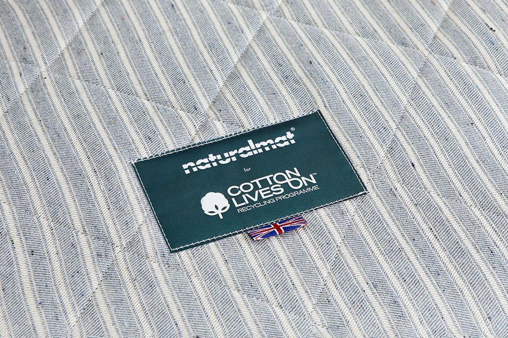 The recycled denim pads are layered together with organic wool and covered with a recycled cotton mattress ticking to make our exclusive Naturalmat x Cotton Lives On™ mattresses.