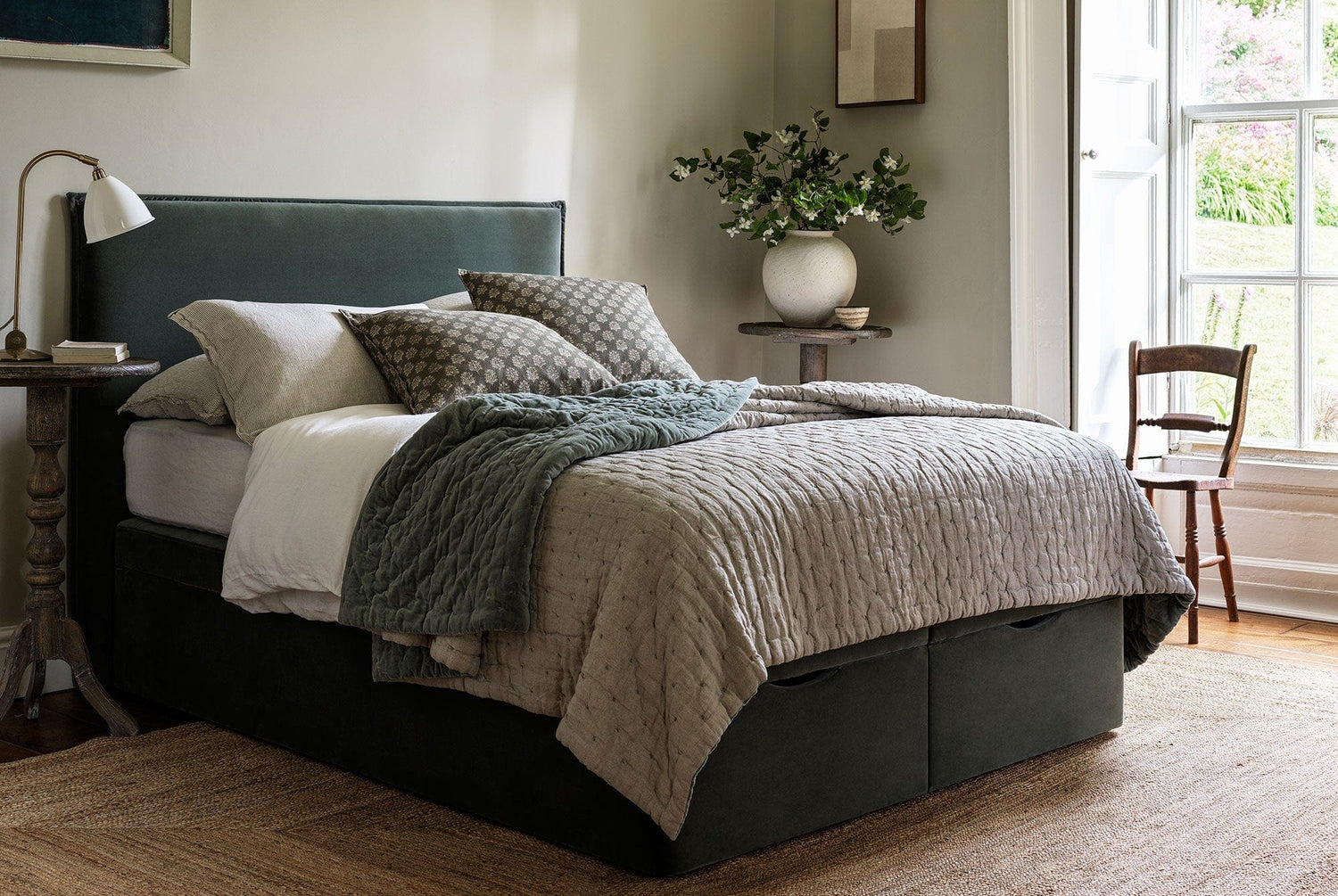 The Ottoman takes the appearance of a standard divan base, raised 2cm from the floor on short oak bun feet. It is beneath this unassuming exterior that the Ottoman hides its party piece - powerful gas struts that allow the entire mattress to be easily raised, opening up a vast area of under-bed storage.