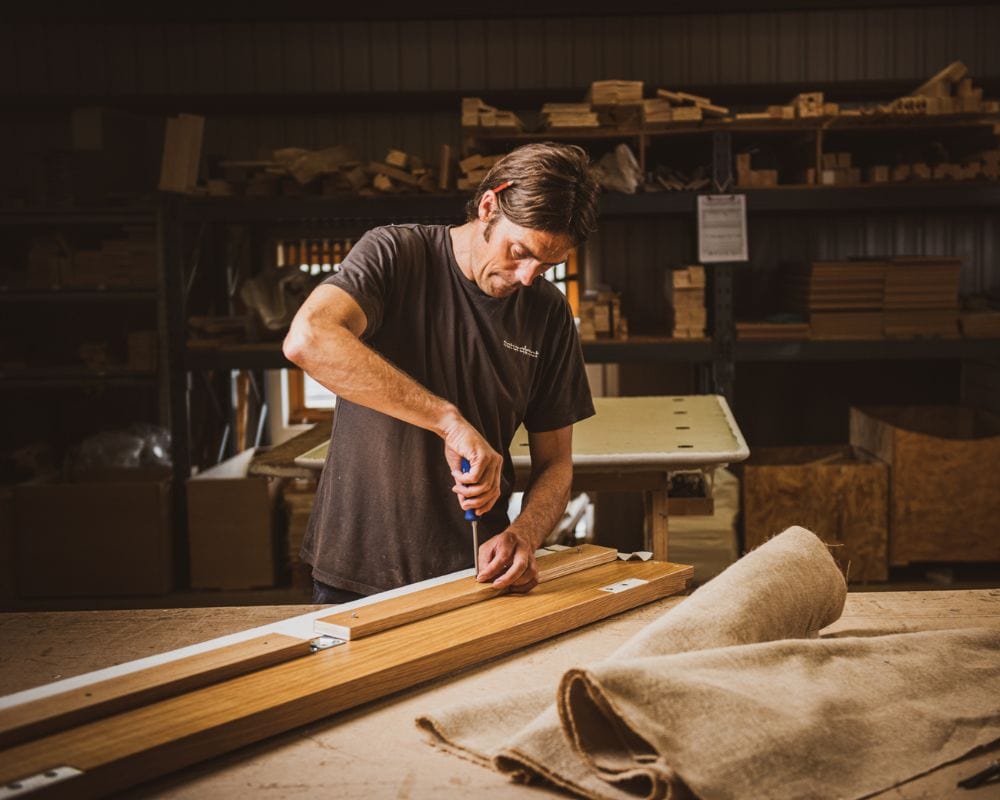 Each Torrington bed, bed base or headboard is hand built from sustainably sourced timber only to ensure our impact on the environment is as small as possible, whilst the materials we use are of the highest quality at our solar-powered workshop in Topsham by talented craftspeople, like Tom here.