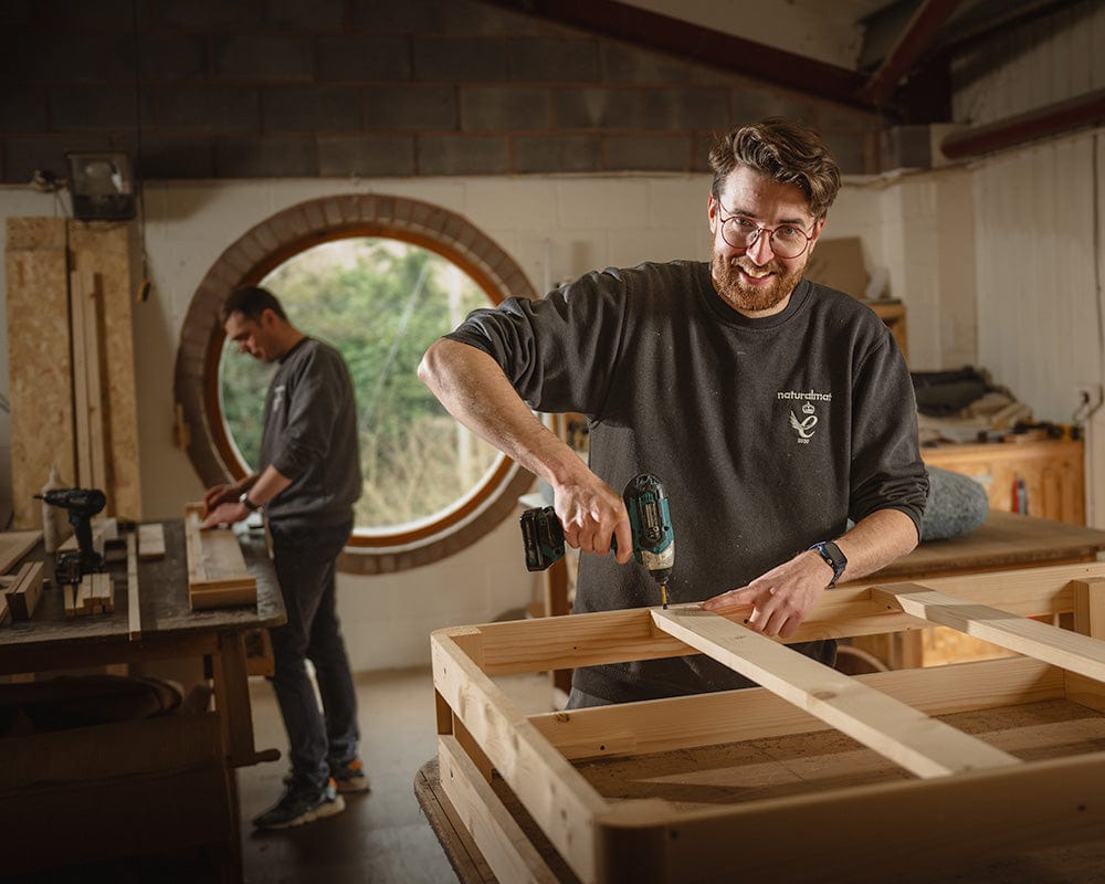 We handcraft our beds in our Devon workshop using traditional joinery techniques which ensure they last a lifetime. Unlike most bed frames which are simply stapled together, ours are glued (using a non-toxic glue) and screwed for a much sturdier and longer lasting construction. And because we make everything ourselves, we’re always happy to accommodate bespoke requests like making headboards taller or wider, or swapping the standard feet for something different.